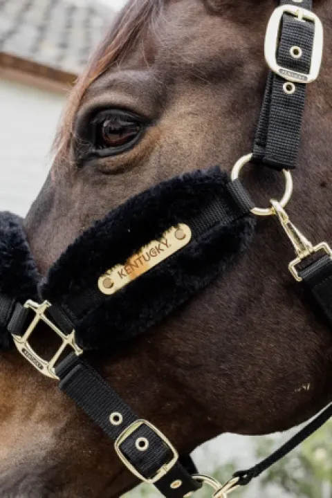 Le licol est fabriqué en nylon. De la peau de mouton artificielle est cousue sur le nylon au niveau du nez, derrière les oreilles et sur les joues. Le licol comporte une plaque dorée sur laquelle est gravé notre logo. Cette plaque peut être retournée et gravée au nom de votre cheval. Toutes les boucles sont dorées et s’harmonisent donc parfaitement avec nos laisses.