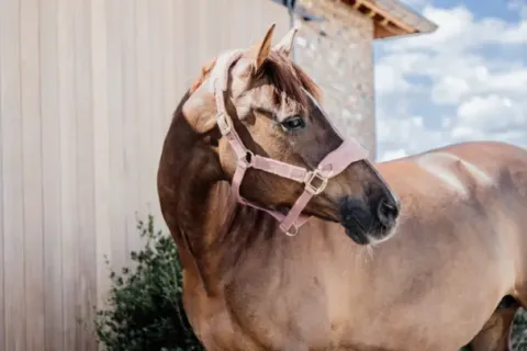 Le licol comporte une plaque dorée sur laquelle est gravé notre logo. Cette plaque peut être retournée et gravée au nom de votre cheval. Toutes les fermetures sont dorées et s’accordent donc parfaitement avec nos longes.