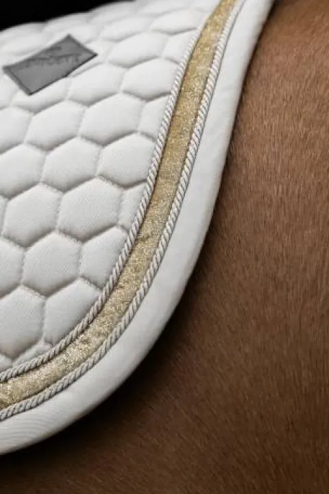 Avec sa bande pailletée élégante, le Tapis de Selle Glitter Band apporte une touche de sophistication à votre cheval. Son design exclusif attire le regard, que ce soit à l’entraînement ou en concours. De plus, il offre un espace généreux pour la broderie personnalisée, vous permettant d’ajouter une touche personnelle.