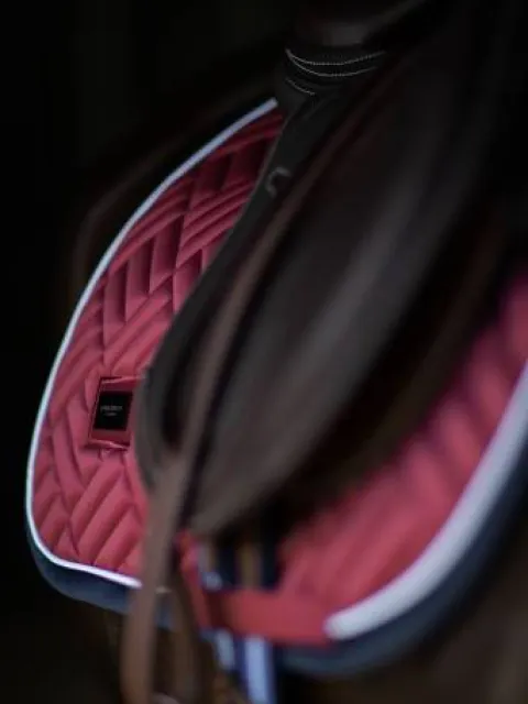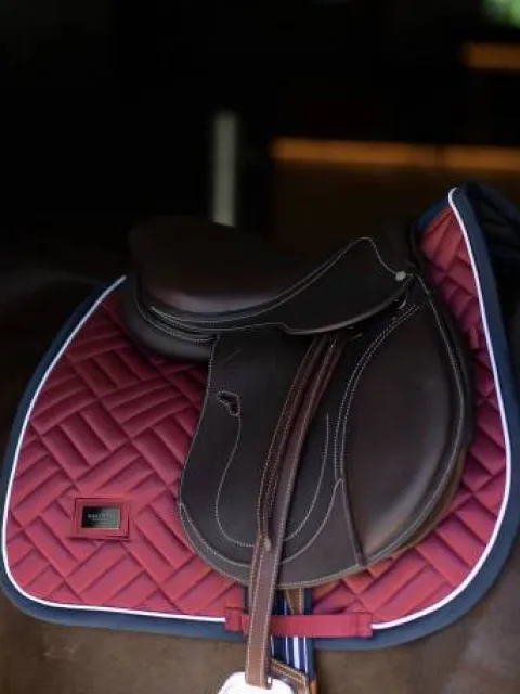 Tapis de selle élégant avec un design moderne, en deep red avec des détails blanc et bleu marine. Décoré d’un badge Equestrian Stockholm en noir.