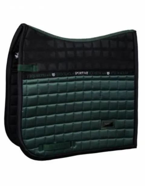 Tapis de selle au design sportif vert foncé, avec du mesh noir décoratif et un badge Equestrian Stockholm noir.