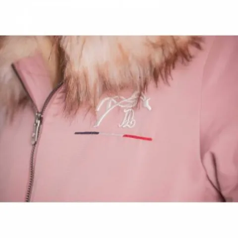 Équipé d’une fermeture éclair pratique, d’une capuche bordée de fausse fourrure pour une touche cosy, et de deux poches boutonnées à l’avant, ce modèle se distingue également par une poche zippée sur le bras gauche qui ajoute une note sportive et fonctionnelle. Le logo Pénélope côté cœur signe ce modèle d’une empreinte élégante et féminine.