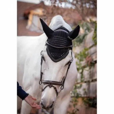 - Avec sa coupe en V il se posera parfaitement sur le chanfrein de votre cheval, avec le tissu stretch sur les oreilles il pourra s’adapter aux différentes tailles d’oreilles.