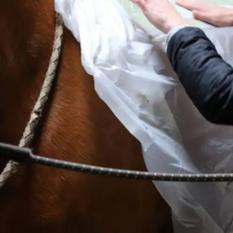 - Indispensable pour favoriser et accélérer l’action des soins posés et garder la chaleur au contact du cheval.