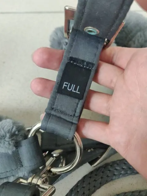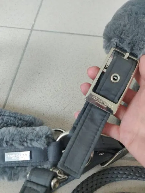 Licol gris avec moumoutte gris. Vendu avec la longe assortie. N’a été porté qu’une ou deux fois, mais trop grand pour ma jument qui taille en COB.
