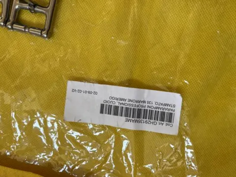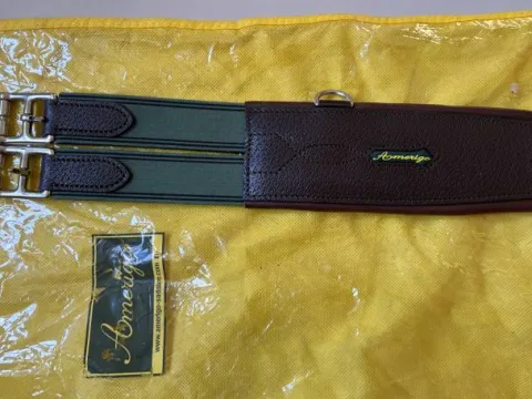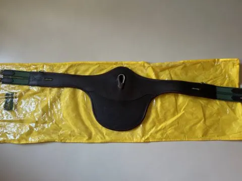 Description: Sangle bavette en cuir résistant avec une bordure en veau souple et des élastiques de chaque côté afin de permettre un réglage central.