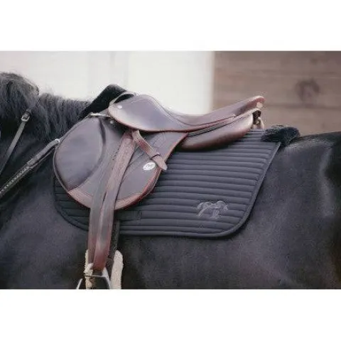 Tapis de selle « Lyona » Pénélope au fin matelassage horizontal, doté d’un renfort en fausse fourrure sous la selle, puis au niveau du garrot et à l’arrière de la selle.