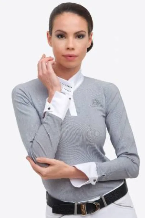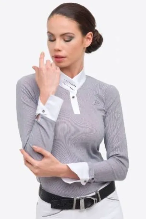 Pour les femmes éternelles… Cet élégant polo de concours est coupé dans une ligne intemporelle et doté d’un col spécial avec une encolure en V. Réalisé dans un tissu à base de coton extensible, il présente un motif micro rayé noir et blanc, agrémenté d’une belle décoration en cristal gris sur son col. Un choix sophistiqué pour toutes les compétitions.