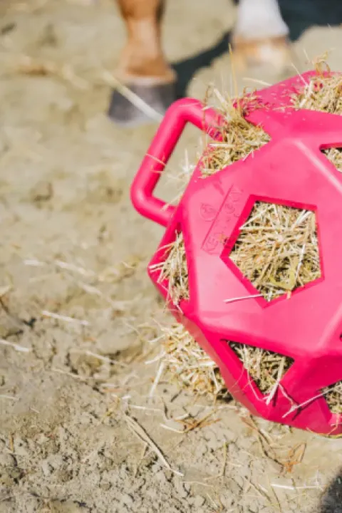 Un accessoire indispensable dans chaque écurie pour occuper votre cheval. Cette balle de jeu / foin est le meilleur moyen d’éviter l’ennui. Elle aidera également votre cheval à manger plus lentement quand il mange trop vite. La balle à foin peut être utilisée dans les écuries, mais elle est également idéale pour le transport.