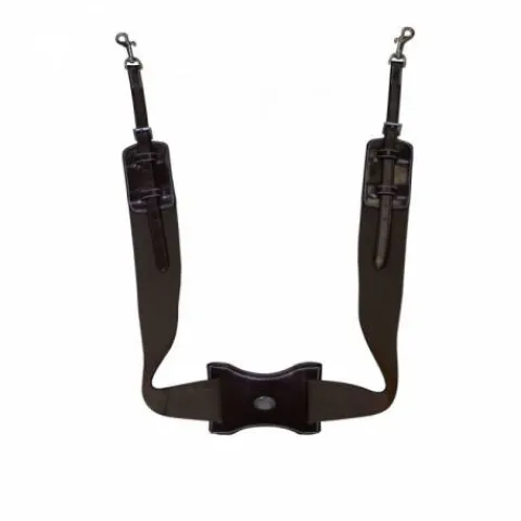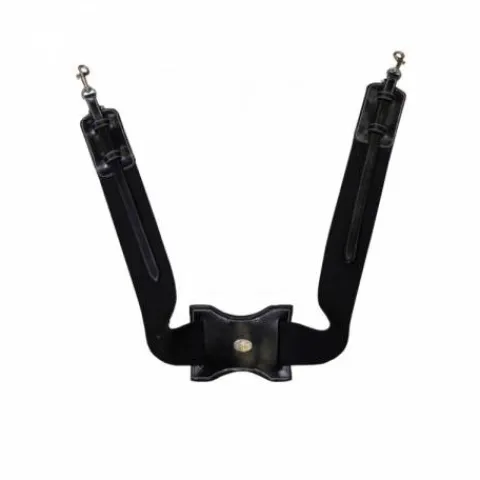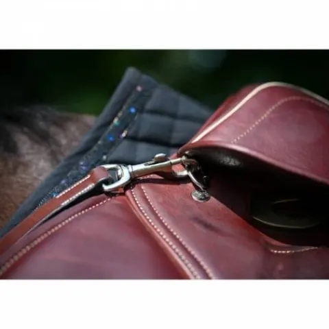 - A chaque extrémité, on trouve deux lanières réglables dotées de deux mousquetons qui s’accrochent aux anneaux situés à l’avant de la selle.