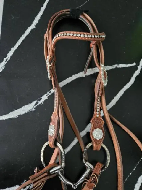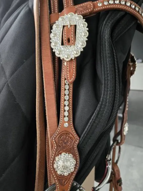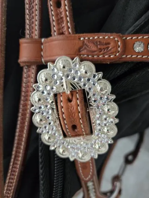 Bridon de show western de couleur chestnut avec flower tooling et boucles avec strass. Split reins.