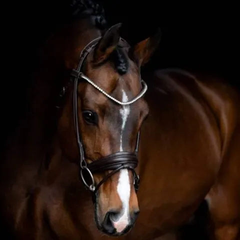 Son frontal est orné de cristaux de 6 mm, ajoutant une touche d’élégance à l’ensemble. La têtière, au design innovant, a été spécialement conçue pour réduire la pression sur la nuque de votre cheval. Grâce à sa grande surface de contact et à sa double couche de rembourrage, elle offre un confort inégalé.