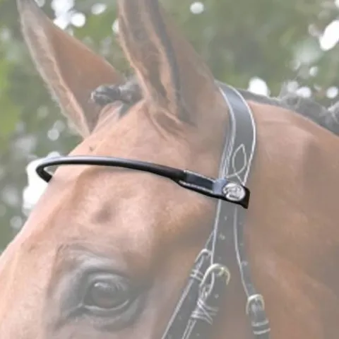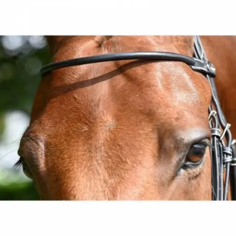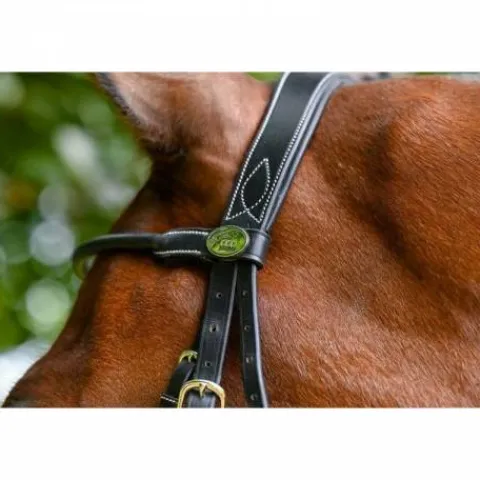Frontal en cuir haut de gamme rond assorti au bridon Monday de la gamme Week et orné du pin’s argenté avec le logo Jump’In gravé.