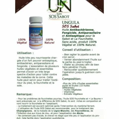 Huile très peu nourrissante chargée d’un fort pouvoir antiseptique, antibactérien, antiparasitaire et fongicide. L’association de plusieurs huiles végétales et essentielles permet d’avoir un très large spectre d’action pour lutter contre les maladies de la corne. Cette huile peut servir pour traiter l’extérieur du pied, la fourchette et la sole.