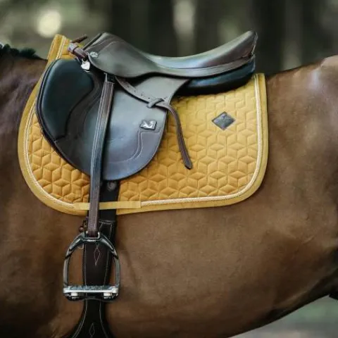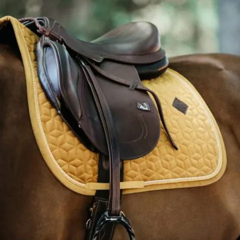 Le tapis de selle Velvet obstacle Kentucky est conçu pour une selle d’obstacle. Le modèle est de couleur mourtarde.