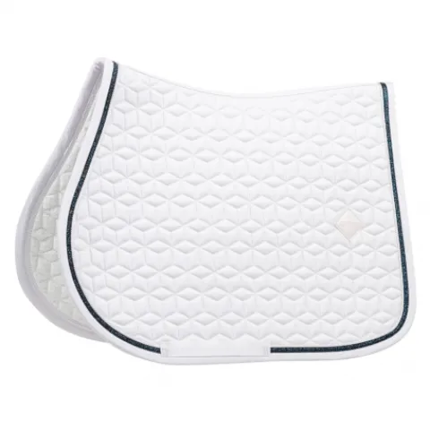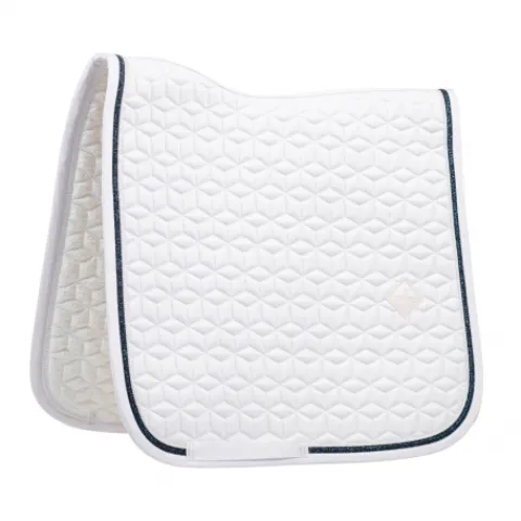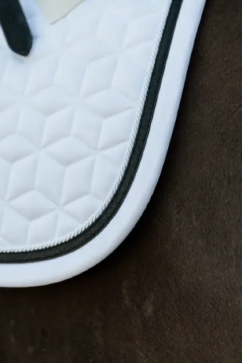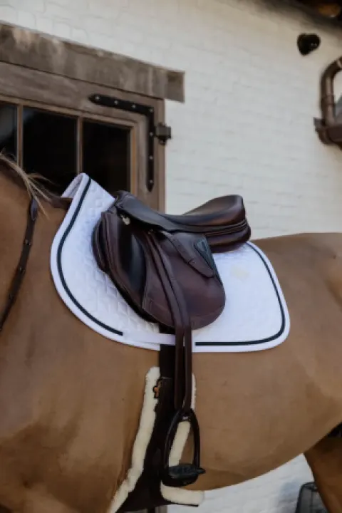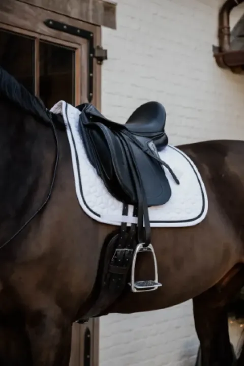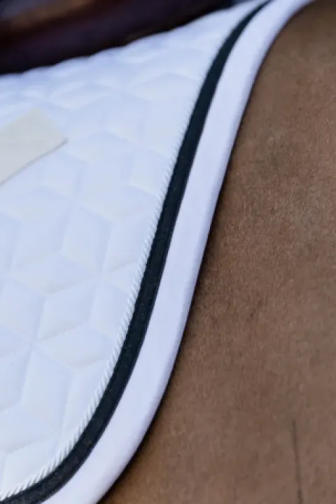 Ce tapis de selle possède un matelassage étoile unique ainsi qu’un liseré pailleté.