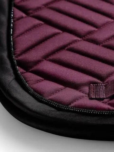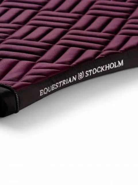 Tapis de selle élégant avec des surpiqures modernes, en violet foncé avec des détails noir et argent. Décoré d’un badge Equestrian Stockholm en noir.