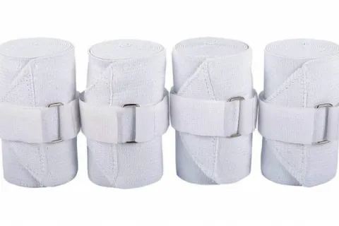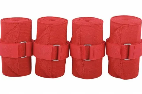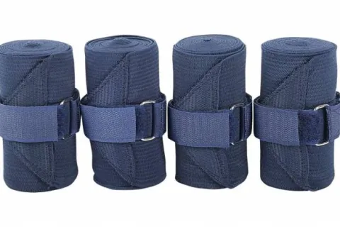 Lot de 4 bandes de travail à élasticité permanente avec fermeture à velcro . Elles permettent de soutenir le tendon et protège le membre lorsque le cheval est au travail. La bande de travail est confortable et aérée, elle résiste à la transpiration. La largeur est 10 cm et étirable jusqu’à 4 mètres.
