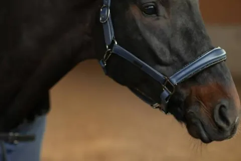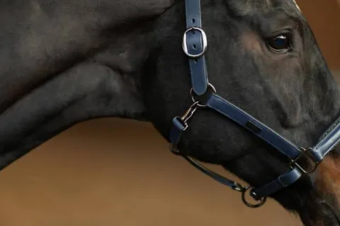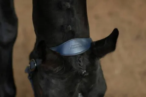 La taille peut être ajustée facilement et rapidement aussi bien sur le côté droit que sur le côté gauche de la tête du cheval. Il est conçu dans une élégante couleur bleu denim et décoré de magnifiques cristaux noirs sur toute la muserolle avant, ce qui donnera à votre cheval un look fabuleux et se démarquera lors des competitions.