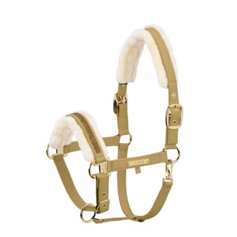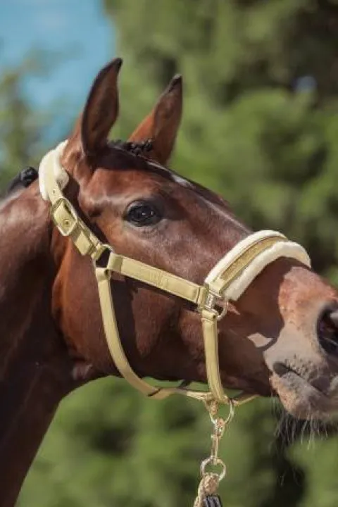 Cet élégant licol, conçu par Eskadron, allie sophistication et fonctionnalité grâce à sa construction en similicuir premium. Le rembourrage en fausse fourrure enveloppe délicatement la muserolle et la têtière, offrant un confort optimal pour votre cheval. Les boucles de fermeture bilatérales permettent un ajustement précis, tandis que la sous-gorge réglable assure une tenue sécurisée. Les détails raffinés, tels que la bouclerie dorée et les cristaux scintillants ornant la muserolle, ajoutent une touche de luxe, sans oublier la signature Eskadron gravée sur le côté.