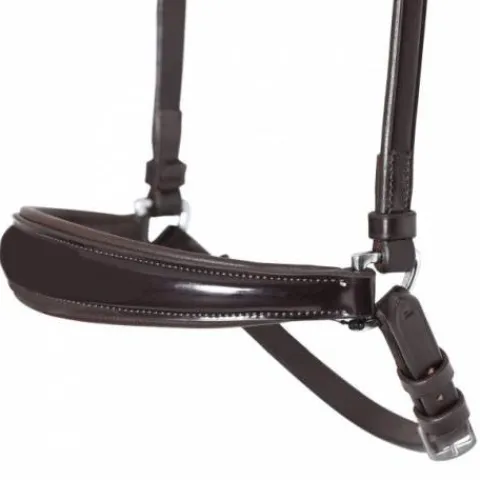 Muserolle allemande avec une surface brillante en cuir verni. Cette muserolle est conçue pour offrir un rembourrage doux, protégeant ainsi l’arête du nez de votre cheval.
