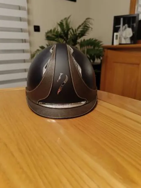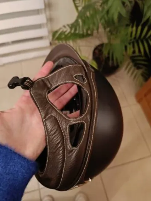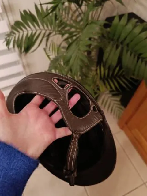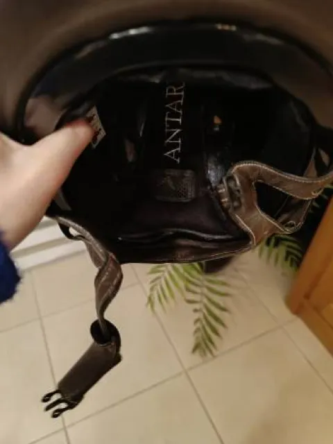 Le sublime casque de la marque Antarès, qui allie légèreté et sécurité le tout avec un look ultra tendance. Casque de couleur bleu foncé mate et marron sur le cuir. Porté une année quelque marque d’usure. Casque taille 55 mousse vendu avec !