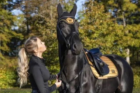 Cordelette jaune et bande pailleté noire. Logo doré et patch tissu satiné jaune foncé.