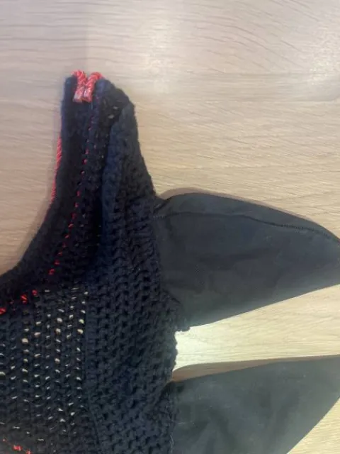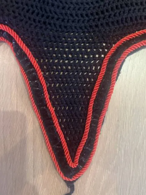 Bonjour, je vends mon bonnet long noir et rouge en taille cheval.