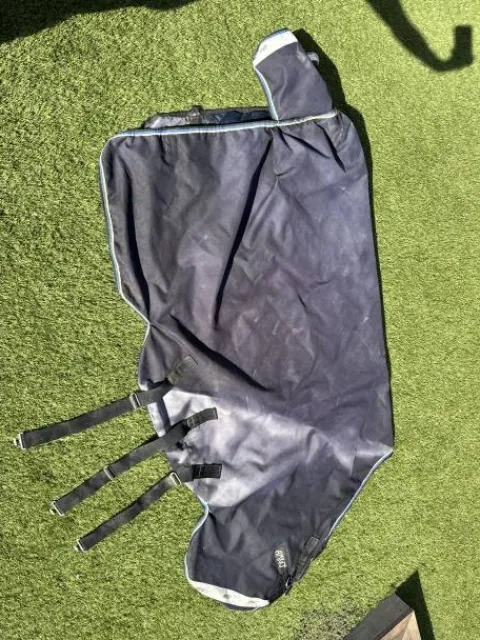 Bonjour, je vends ma couverture horseware bleu marine 250g, elle est en très bon état, seulement des accros qui ont été recousus à l’intérieur du couvre cou mais sinon la couverture est intacte à l’extérieur (hormis que la couleur a tourné).