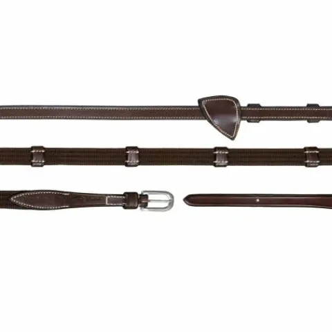 Ce sont des rênes en tissu avec 9 arrêtoirs en cuir sur la toile. Largeur 16 mm