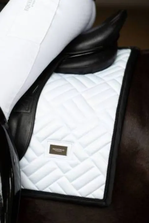 Tapis de selle d’équitation élégant de couleur blanche avec des surpiqures modernes et une bordure noir avec des détails argentés.
