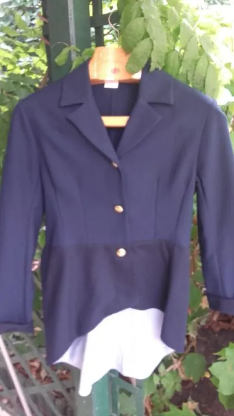 Veste à basque bi-matière. Tissu extensible. Basque doublée bleu ciel. Boutons dorés.