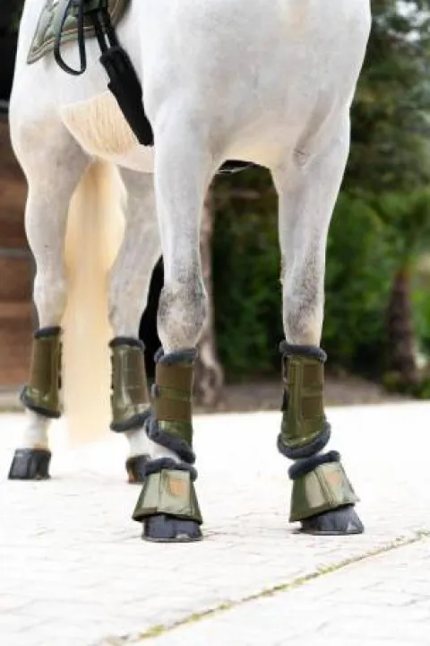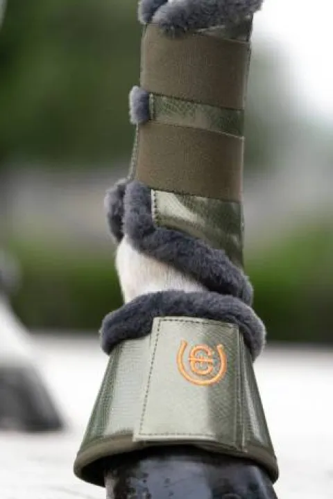 - Conçu dans une élégante couleur verte avec des détails élégants en or rose. Fausse fourrure grise foncé super douce à l’intérieur contre la jambe du cheval.