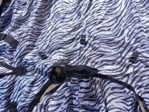 Couverture anti mouche zèbrée, de marque Première légère et respirante. Neuve avec étiquette, jamais utilisée! Taille 157 voir photos.