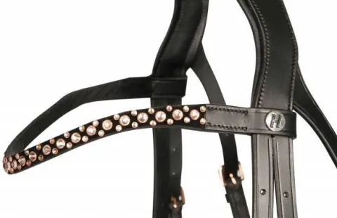 Luxueuse bride avec rembourrage doux sous la têtière et la muserolle. La muserolle est de forme anatomique et plus étroite au niveau du mors. Fabriqué avec des boucles en or rose et de beaux cristaux en or rose sur le frontal et le long de la muserolle. Têtière très confortable et de forme anatomique pour une meilleure répartition de la pression.