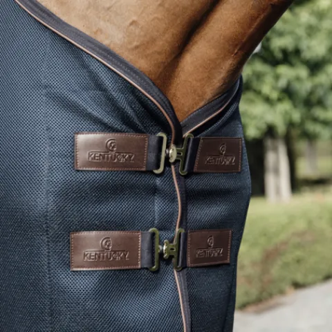 La chemise est de forme anatomique sur le dos ainsi que sur les épaules afin de bien s’adapter à votre cheval. Pour plus de confort, nous avons ajouté du mouton artificiel au niveau du garrot et des sanglons amovibles. Ainsi, vous pouvez facilement la transformer en une couverture de concours en enlevant les sanglons. De plus, nous avons ajouté notre passepoil en cuir artificiel marron et le logo Kentucky pour un look luxueux.