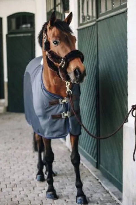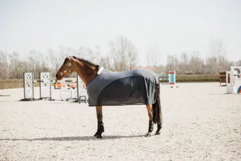 Cette couverture au look très luxueux est le partenaire idéal pour les compétitions ou le transport. La Cooler Sheet Softshell est spécialement conçue pour protéger les chevaux contre le vent froid car elle agit comme une seconde peau. Elle est très respirante et donc très confortable pour le cheval. Dans la partie inférieure se trouve un tissu en mailles extrêmement respirantes qui empêche les mouches de toucher le cheval. Le mouton artificiel protège le garrot contre les frottements et les éventuelles pressions. La Cooler Sheet Softshell est dotée d’une double fermeture consolidée par une fermeture velcro sur le poitrail, le tout renforcé par du cuir artificiel. Les deux sur-sangles ventrales sont détachables et attachées à l’intérieur de la couverture. Un cordon élastique en nylon permet de maintenir la couverture en place. Il est détachable et possède une protection en plastique qui permet un nettoyage facile. La couverture est lavable en machine à 30°, pas de sèche-linge.
