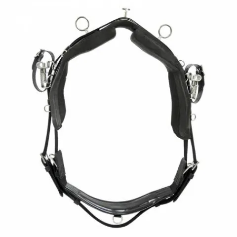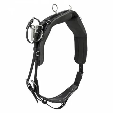 Ce harnais QH pad cousu complet est conçu pour offrir un excellent contact avec le dos du cheval grâce à sa sellette en véritable biothane avec un pad en mousse cousu. Il comprend également une sangle en caoutchouc, une croupière avec culeron à boucles, une bricole de type français, une paire de guides avec poignées et des dés pour la fixation de débouche-oreilles, ainsi qu’une bride complète avec enrênement et tour de nez de muserolle.