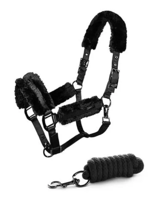 - Licol confortable avec fausse fourrure. Conçu dans une élégante couleur noire, avec une fausse fourrure noire et des boucles chromées. Orné de l’élégant badge Equestrian Stockholm en noir et du logo Equestrian Stockholm sur la muserolle.