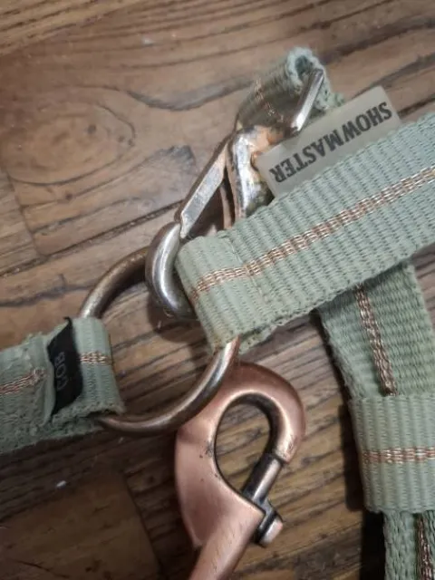 La couleur rose cold du mousqueton de la longe et des anneaux du licol s’écaille