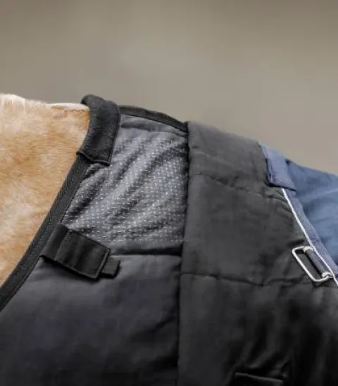 L’extérieur de la couverture est doté d’une impression en silicone sur le dos, ce qui aide à prévenir le glissement de la couverture posée par-dessus. Elle est équipée d’une fermeture en T au poitrail avec élastique et rabat à scratch pour un maintien optimal. De plus, deux bandes élastiques à scratch sont présentes sur chaque épaule et à l’arrière, facilitant l’accrochage avec toutes les couvertures d’extérieur de la marque Waldhausen.