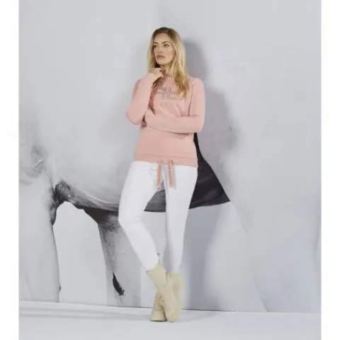 - Le modèle en rose poudré : Il y a 2 « P » (dont un à l’envers) pour Pikeur qui sont mis sur l’avant du sweat tout en strass. En-dessous, il y a le nom de la marque qui est en strass également.