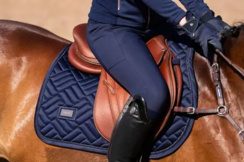 Tapis de selle élégant, avec surpiqures graphiques en bleu marine et détails rosegold.
