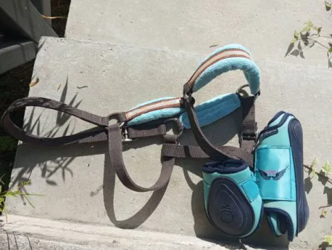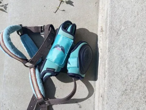 Je vends ces guêtres et protèges boulet bleu turquoise, de la marque fouganza, taille poney à 10 €.