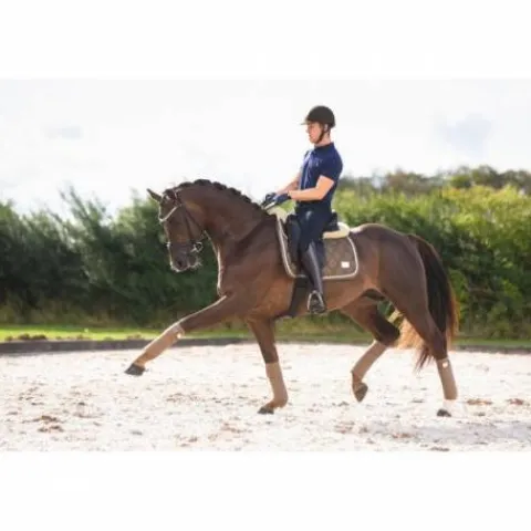 - Les bandes sont fabriqués dans le même tissu d’aspect métallique brillant que le tapis de selle, et se marient parfaitement.