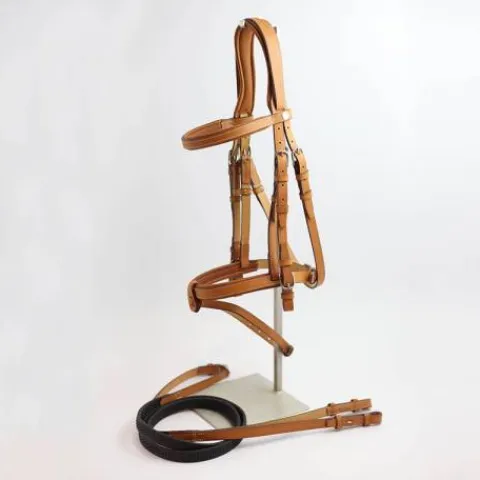 Bride de CSO haut de gamme avec des boucles “lyre” classiques. Cuir dosset couleur naturelle, tranches cirées marron. Montage classique avec muserolle indépendante. Frontal et muserolle doublés avec matelassures. Toutes les coutures sont réalisées à la main avec le “point de sellier”.