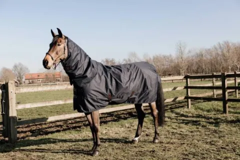 La classique imperméable n’a pas de couture à l’arrière de la couverture, ce qui évite le risque de fuite. Pour plus de chaleur, vous pouvez utiliser cette couverture avec une sous-couverture, comme la sous-couverture classic. Au cas où votre cheval aurait besoin d’une protection supplémentaire, un couvre-cou détachable peut être acheté séparément. Les finitions sont au style Kentucky : la couverture a 2 fermetures frontales en laiton et en acier inoxydable, combinées à une solide fermeture autoaggripante, deux sursangles et un cordon de queue détachable.