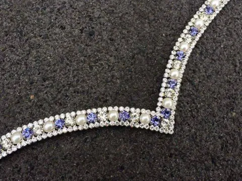 - Deux rangées de strass blancs encadrant une rangée de strass bleu indigo