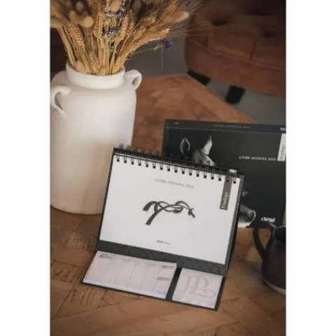 - Il est composé d’une reliure spiralaire métallique et un socle en carton renforcé. Sur la face recto de la page organisation, des photos variées de la cavalière généreusement légendées permettent d’en savoir plus sur la cavalière. A droite de la partie agenda, un joli bloc-notes avec de petites feuilles autocollantes estampillées du monogramme PL, permet de tout noter pour ne jamais rien oublier.