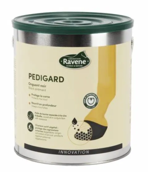 Pedigard onguent noir contribue à fortifier la corne tout en préservant son élasticité. L’huile de baie de laurier, riche en acide laurique assouplit la corne en profondeur. La cire d’abeille, nourrisante car riche en vitamine A, apporte également une action imperméabilisante : elle retient l’eau dans le pied permettant de lutter contre le dessèchement et joue le rôle de barrière contre les agressions extérieures. Cette barrière est renforcée par le charbon végétal dont la porosité lui confère une capacité d’adsorption des agents extérieurs. Souple et protégé le pied retrouve toutes ses propriétés biomécaniques.